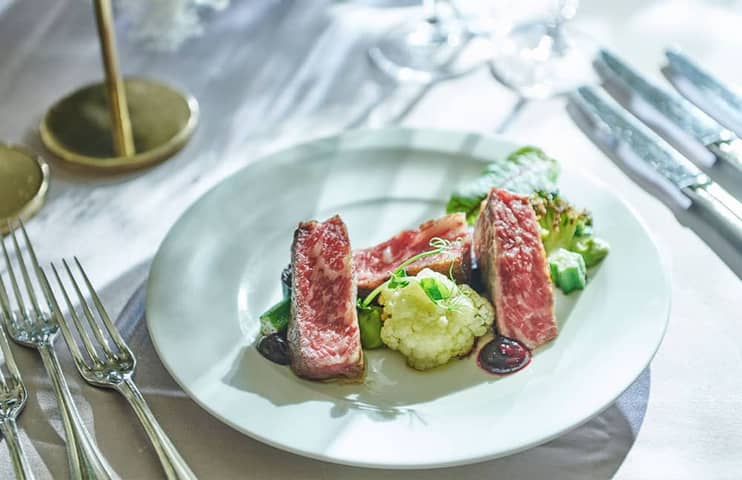 婚礼料理の王道、フレンチに和の要素を加えたオリジナルフレンチ「ヌーヴェル・キュイジーヌ・ジャポン」。一皿一皿に和のエッセンスを感じられるお料理は、お箸でも食べられるので幅広い年齢層に好評です。隣接したキッチンから届けられる「湯気を感じられるお料理」でおふたりにかわりゲストをもてなします。